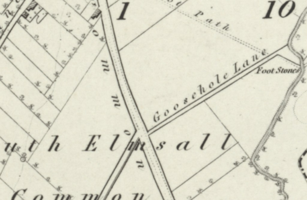 In January 1827 the freehold lands of the late Mary Stocks were auctioned. These lands were extensive and included lot 25, various closes of land, including Goose Holes, in the occupation of Mr G. Smith. The Ordnance Survey map of 1854 shows that Goosehole Lane then was just a short lane leading north east from Common Lane (today Doncaster Road). The area was agricultural but did feature a set of foot stones to cross the beck, and a short foot path leading north west across the fields. In 1854 Goosehole Lane, as today, intersected Common Lane (Doncaster Road) where the mini roundabout exists today.